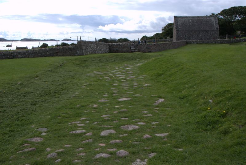 This medieval street is the extension into the abbey of the "street of the dead," the roadway running from the Monks' landing place at Martyrs' Bay to Reilig Odhráin, the graveyard