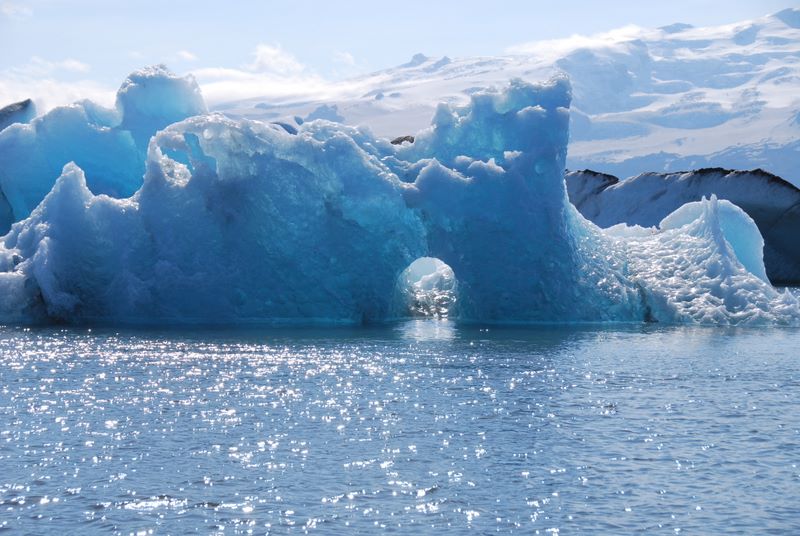 A large round hole formed by water running down a smaller hole in the glacier