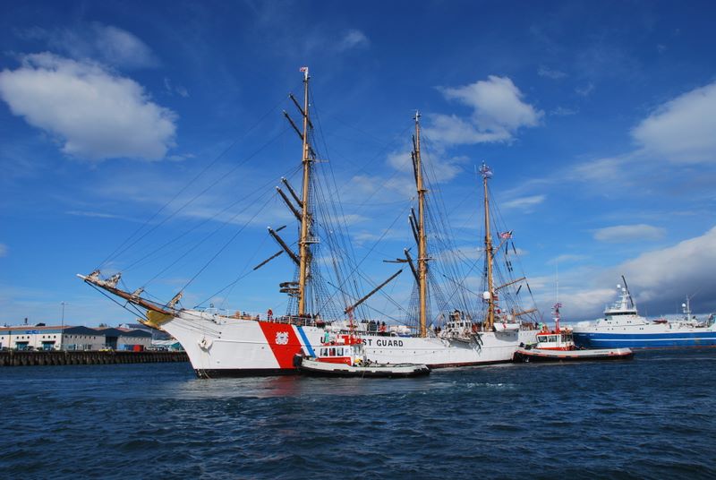 Barque Eagle of the US Coast Guard being assisted onto the dock ... wind speed 25 knots abeam
